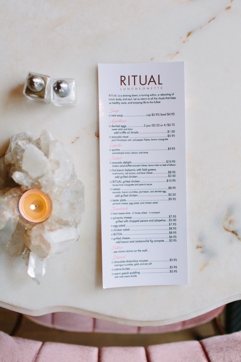 Welcome to RITUAL - Jacksonville, a culinary gem nestled in the heart of Jacksonville, Texas. This inviting eatery specializes in fresh, gluten-free options that celebrate vibrant flavors and locally sourced ingredients. The menu offers a delightful array of salads, including the Ritual Grilled Chicken with a honey lime vinaigrette and a tempting Avocado Delight, combining chicken salad-stuffed avocado halves over crisp lettuce. For those craving something savory, the Quiche featuring caramelized onion, bacon, and Swiss cheese is a must-try.